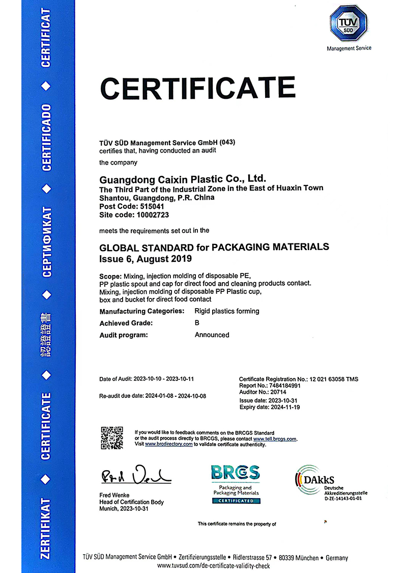 وإلى جانب ذلك، فقد حصلت منتجاتنا شركتنا Caixin Plastic على العديد من الشهادات الدولية، منها شهدة نظام إدارة الجودة ISO9001 وشهادات SGS و FDA. ولدينا القدرة حالياً على إنتاج أكثر من 1000 نمط مختلف من الحاويات البلاستيكية وقواعد الحنفيات والأنابيب والأغطية والتي تُستخدم على نطاق واسع في المستحضرات الصيدلانية الحيوية والسوائل الكيميائية والأغذية والمشروبات وغيرها من الصناعات الأخرى.